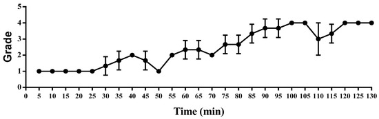 The behaviors of crucian carp induced by hypoxia were observed and documented in this study. Notably, hypoxic stress elicited distinct abnormal behavioral patterns, specifically: (1) surface swimming behavior, characterized by vertical positioning in the upper water column; (2) air-breathing behavior, manifested by protruding the mouth above water surface. Based on established hypoxia stress behavior grading criteria, we plotted the temporal variation in hypoxic fish counts. As shown in Figure 5, the results demonstrated that behavioral severity escalated gradually, progressing from Level 1 (0–25 min) to Level 4 (85–100 min) as hypoxia intensified.