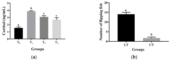 As shown in Figure 6a, the results indicate that the cortisol levels in the stressed groups were significantly elevated compared to the normal controls (p < 0.05). Notably, T1 exhibited substantially higher cortisol concentrations than both the T2 and T3 groups. However, no significant difference was observed between T2 and T3 (p > 0.05).