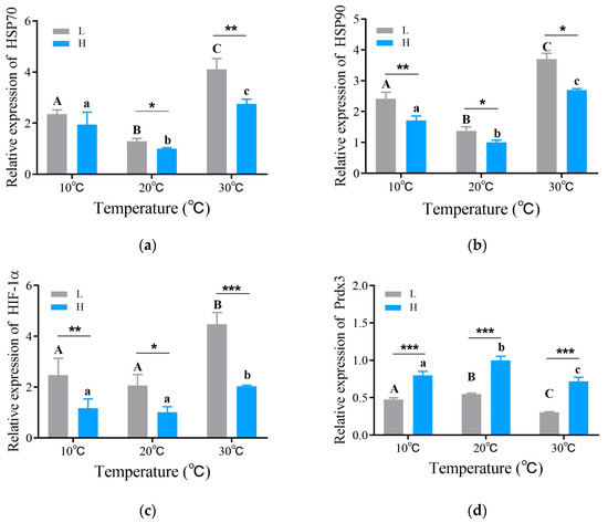 Effects of temperature and oxygen stress on the expression levels of HSP70, HSP90, HIF-1α, and Prdx3 in the liver of Crucian carp. Different uppercase and lowercase letters denote significant differences between treatments (p < 0.05). * indicates p < 0.05; ** indicates p < 0.01; *** indicates p < 0.001. (a) HSP70; (b) HSP90; (c) HIF-1α; (d) Prdx3.