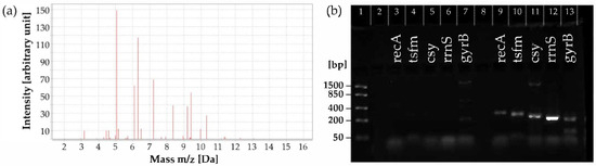 (a) Exemplary MALDI-TOF mass spectrum of a bacterial isolate with characteristic mass-to-charge (m/z) peaks. The pattern of peaks displays a representative protein profile shared by Aeromonas salmonicida, A. bestiarum and A. eucrenophila. (b) Exemplary gene expression profiling of six A. salmonicida genes (recA, tsfm, cys, rrnS and gyrB) in water samples. Standard PCR was performed on DNA extracted from sterile (lanes 3−7) and contaminated (lanes 9−13) water samples to assess pathogen presence. A DNA-size marker is shown in lane 1; band sizes (in base pairs, bp) are indicated on the left.