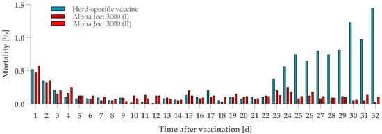 Relative tank-specific losses [%] following immunisation with different injection vaccines. The chart displays daily mortality data from tanks vaccinated with either the herd-specific vaccine (blue bars) or the Alpha Ject 3000 vaccine (dark and light red bars).