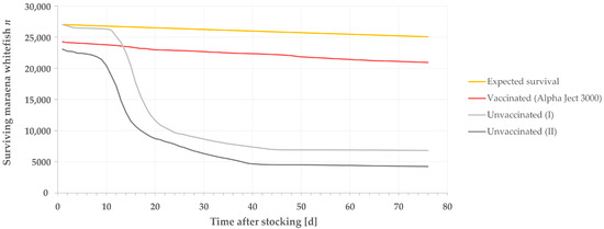 Population dynamics of vaccinated versus unvaccinated maraena whitefish. The graph shows the number of surviving whitefish over time (in days post-stocking) across three cohorts: those vaccinated with Alpha Ject 3000 (red line) and two unvaccinated groups (grey lines) compared to the expected survival rate (orange line). Stocking was conducted 4 weeks post-vaccination.