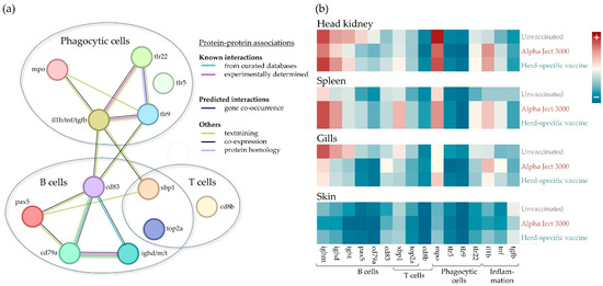 (a) Predicted protein–protein associations of expressed genes selected for present qPCR profiling. The STRING tool identified joint contributions to a shared function indicated by connecting lines (cf. legend on the right). Genes/proteins typically synthesised by phagocytes, T or B cells were framed. (b) Heatmap representation of log2-transformed transcript numbers quantified in four tissues (head kidney, spleen, gills and skin) of maraena whitefish under three different vaccination conditions: unvaccinated, one year post-vaccination with Alpha Ject 3000 or a herd-specific vaccine. Each row represents a different treatment group and each column represents a specific gene. Gene symbols, categorised according to their function shown in (a), are listed below the heatmaps. Colours indicate high (dark red) or low (dark blue) transcript numbers.