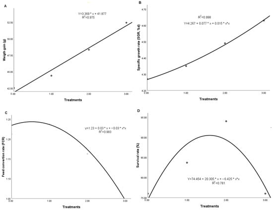 | Treatments | Initial Weight (g) | Final Weight (g) | Final Length (cm) | Weight Gain (g) | Specific Growth Rate (%/d) | Feed Conversion Ratio | Survival Rate (%) |