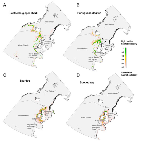 APA StyleMercker, M., Müller, M., Werner, T., & Hennicke, J. (2025). Identification of Suitable Habitats for Threatened Elasmobranch Species in the OSPAR Maritime Area. Fishes, 10(8), 393. https://doi.org/10.3390/fishes10080393