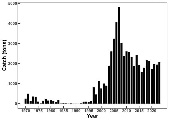 The annual catch trend of snow crabs in Korean waters from 1970 to 2023 shows a marked change after the implementation of the TAC in 2002. Subsequently, the catch began to increase significantly, peaking at approximately 4.8 thousand tons in 2007. Since then, the catch has decreased gradually, and the average catch for the last five years (2019–2023) was approximately 2.0 thousand tons (Figure 1).