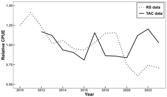 The standardized CPUEs used in this study exhibited different patterns between the TAC and RS data, which was one of the major differences reflected in the BSM results (Figure 2). While the TAC data-based CPUE fluctuated within a certain range from 2012 to 2023, the RS data-based CPUE showed an overall decreasing trend from 2010 to 2023 and decreased significantly after 2020.