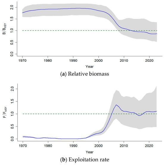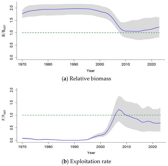 The specific PPVR values for each case are summarized in Table 7. The PPVR value of B/k in the end year (2023) was 1.05 for the model using TAC data-based CPUE, indicating that the posterior variance was nearly identical to the prior variance, which suggests that the data provided minimal additional information. In contrast, the PPVR of 2.13 for the RS data-based CPUE suggests that the posterior variance was significantly higher than the prior variance, indicating that the data introduced additional uncertainty.
