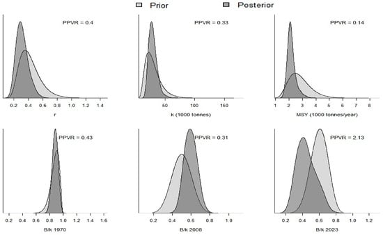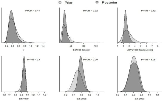 First, the PPVR was computed for key parameters, including r, k, MSY, and B/k. The PPVR was used to evaluate how much prior information influenced the model estimates and how effectively the data contributed to updating the assumptions based on prior information []. A PPVR value less than 1.0 indicates substantial learning from the data, whereas a value close to or greater than 1.0 suggests limited or uncertain updating of the prior information. For each parameter, prior and posterior distributions were also visualized to qualitatively assess directional shifts and reductions in uncertainty.