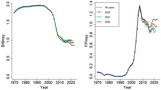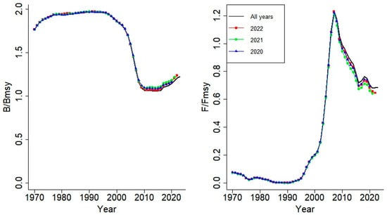 Second, the retrospective analysis was performed by sequentially removing the most recent years (2023 to 2021) from the time series to evaluate the temporal stability of the estimated stock status. The consistency of estimated relative biomass (B/BMSY) and fishing mortality (F/FMSY) across truncated datasets was evaluated to assess the sensitivity of the model to recent data.