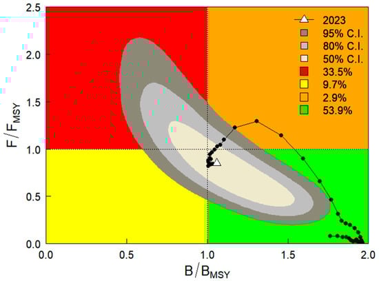 Since recent years’ stock status of snow crabs in Korean waters showed some differences depending on the abundance indices, to reflect the structural uncertainty associated with the selection of CPUE index, we treated each CPUE series as an independent model scenario within a single-axis uncertainty grid. Although no additional axes of uncertainty (e.g., priors for r or B/k) were varied, the abundance index was identified as a key structural variable due to the different trends observed between the two indices. Accordingly, posterior samples (n = 6000 each) derived from the BSM analyses using the TAC-based and RS-based CPUEs were aggregated (n = 12,000 total) and used to estimate the stock status via the Kobe plot. Based on this, the current stock status of snow crabs is estimated to be healthy, with a probability of belonging to the green quadrant of 53.9%, which indicates that the stock is not overfished (B/BMSY > 1) and that overfishing is not occurring (F/FMSY < 1) (Figure 9).