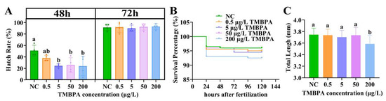 Effects of TMBPA exposure on hatching rate (A), survival percentage (B), and total length (C) in zebrafish. NC denotes the control group. The data were shown as mean ± S.E. (n = 4). Different lowercase letters above bars indicate statistically significant differences (p < 0.05) between treatment groups.
