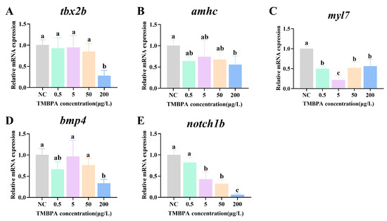 Exposure to 0.5, 5, and 50 μg/L TMBPA had no significant effect on the mRNA levels of tbx2b, amhc, or bmp4 (p > 0.05), whereas 200 μg/L TMBPA significantly decreased their mRNA levels (p < 0.05), compared to the control group (Figure 6A,B,D). The expression levels of myl7 were significantly lower in all treatment groups than those in the control group (p < 0.05; Figure 6C). Additionally, with increasing concentration, the expression levels of notch1b showed a gradual decrease, with the lowest levels in the 200 μg/L group (p < 0.05; Figure 6E).