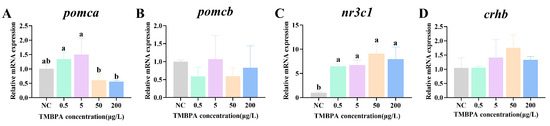 Compared to the control, exposure to 50 μg/L and 200 μg/L TMBPA significantly downregulated pomca expression (p < 0.05; Figure 7A). Conversely, nr3c1 expression in all treatment groups was significantly upregulated compared to the control group (p < 0.05), and no significant difference was observed among the treatment groups (p > 0.05; Figure 7C). There was no significant difference in the expression levels of pomcb and crhb between the treatment group and the control group (p > 0.05; Figure 7B,D).