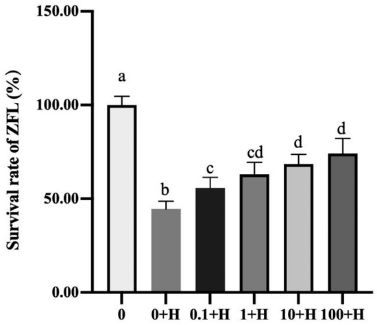 Effects of different concentrations of rutin (0.1–100 µM) on the survival rate of ZFL after histamine stimulation. Different letters (a–d) represent p < 0.05.