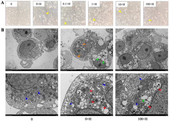 The internal structures of ZFL in 0, 0 + H, and 100 + H obtained by transmission electron microscopy are shown in Figure 2B. The cells in group 0 had a complete membrane structure, clear nuclei and nucleoli, normal oval-shaped mitochondria, uniform distribution, and clear mitochondrial cristae. In the 0 + H group, the cell membrane remained intact, with numerous vacuoles visible inside the cell. Mitochondria were obvious but reduced in number, and some nuclei were lysed, indicating the possibility of apoptotic necrosis of the cell; the appearance of a large number of autophagic lysosomes inside the cell indicated that autophagy may occur. In the 100 + H group, the cell membrane was intact, the intracellular vacuoles were reduced compared to the 0 + H group, the single nucleus was clear, the nucleolus was obvious, the mitochondria were normal, oval-shaped, and autophagic lysosomes appeared inside the cells, indicating that autophagy may occur in the cells.