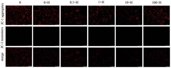 The changes in H2O2 levels are shown in Figure 4B. Compared with the 0 group, the H2O2 level in the 0 + H group was significantly increased (p < 0.05). Compared with the 0 + H group, the H2O2 levels in the 0.1 + H, 1 + H, 10 + H, and 100 + H were significantly down-regulated (p < 0.05).