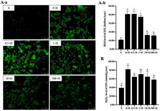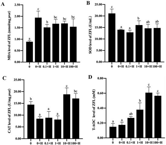 For the ROS levels in ZFL, as shown in Figure 4A, compared with the 0 group, the ROS levels in the 0 + H group were significantly increased (p < 0.05). Compared with the 0 + H group, the ROS levels in each group were dose-dependent. There was no significant change in ROS levels in the 0.1 + H and 1 + H groups (p > 0.05), while ROS levels significantly decreased in the 10 + H and 100 + H groups (p < 0.05).