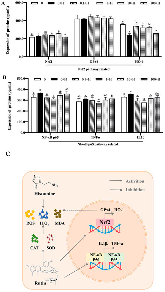 Effects of different concentrations of rutin on the expression levels of key proteins in the Nrf2 signaling pathway (A) and NF-κB signaling pathway (B) in ZFL after histamine stimulation. Visualization of the possible mechanism of rutin in inhibiting histamine-induced cytotoxicity (C). Different letters (a–c) indicate p < 0.05.