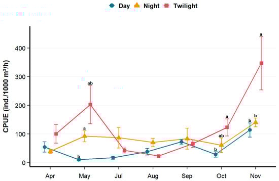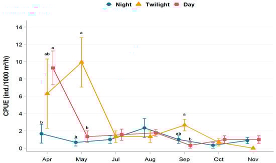 Dong, J.; Song, X.; Zhu, Y.; Liu, Q.; Hu, Z. Diel Catch Variation of the Primary Fish Species Captured by Trammel Nets in a Shallow Eutrophic Lake in Jiangsu Province, China. Fishes 2025, 10, 409. https://doi.org/10.3390/fishes10080409