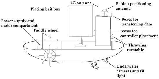 The crab farming feeding boat is mainly composed of floating bodies, paddle wheels, a navigation module, control module, bait and medication dispensing devices, and underwater cameras. Its working modes include manual and automatic. Remote control instructions are issued through an APP to initiate cruising operations and implement precise feeding. The overall structure is shown in Figure 1. The main technical parameters of the feeding boat are shown in Table 1.