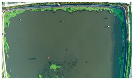 Environment modeling is a crucial step in path planning, helping the algorithm find optimal path that meets multiple constraints. In conventional crab farming ponds, there are often obstacles such as long aerobic pipelines, aerators, fences, and ground cages. Therefore, when modeling the environmental map, comprehensively considering environmental information and whether the working boat can use the map to complete the feeding operation task is necessary. Figure 3 shows a classic crab farming pond located in Xinghua City, Jiangsu Province, China. The pond is approximately 280 m long and 140 m wide, and the image was collected using the DJI Elf 4 drone from the DJI brand in Shenzhen, China. This pond serves as the basis for the actual experimental environment and environmental model studied in this study.