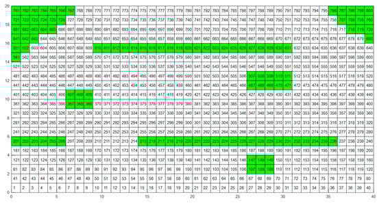 Before using genetic algorithms for path planning, encoding the grid map is necessary []. In this study, a combination of two-dimensional and one-dimensional coordinates is used for map encoding, as shown in Figure 5, where the white area represents the passable area and the green area represents the obstacle area. The one-dimensional coordinates on the grid can be obtained from two-dimensional coordinates by Equation (8). The utilization of one-dimensional coordinates can reduce the encoding length, making it easier for computer programming and computation.
