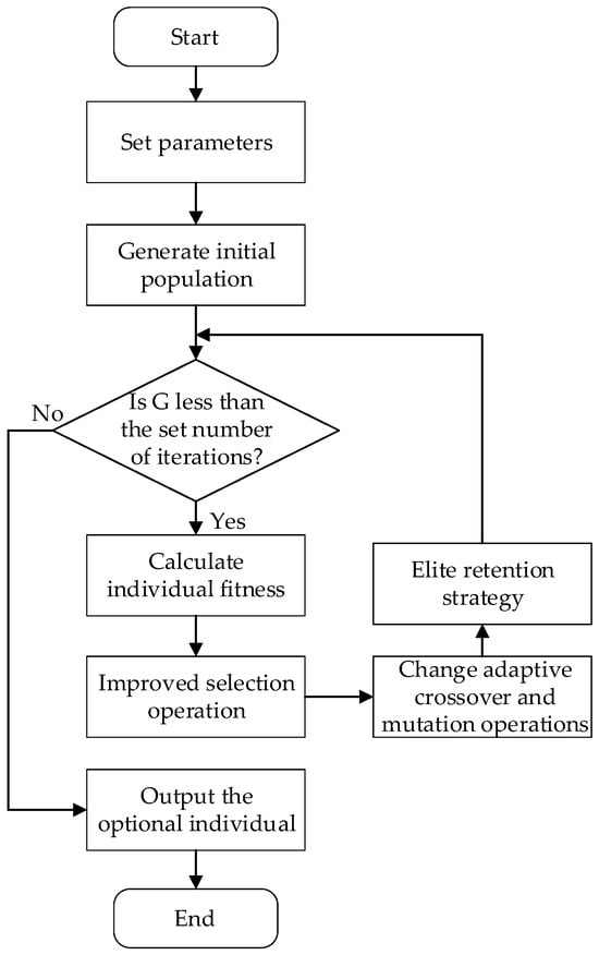 This study employs an improved two-point crossover method. The crossover probability for individuals involved in the crossover changes adaptively. When the fitness of a chromosome is less than the average fitness of the population, its crossover probability is increased to enhance the possibility of mixing and variation with other chromosomes. Conversely, when the fitness of a chromosome is greater than the average fitness of the population, its crossover probability is set to a smaller value to preserve its excellent genes. The specific formula for calculating the individual crossover probability is shown in Equation (10):
