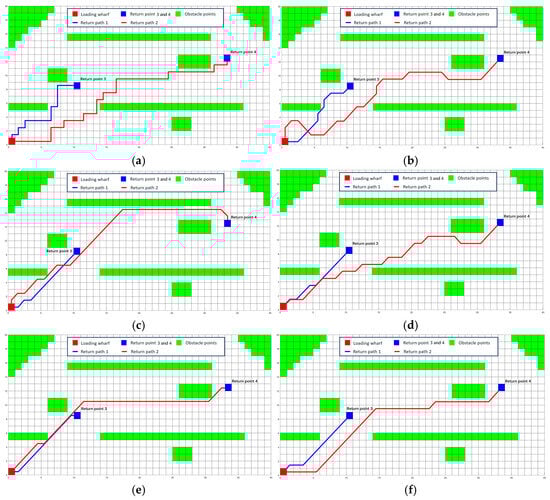 Simulation diagram of six kinds of algorithms for return path planning. (a) QL; (b) TQL; (c) TRQL; (d) TEQL; (e) TREQL; (f) I-QLA.