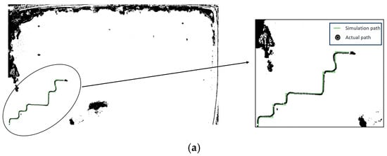 The simulation results of the traditional genetic algorithm and the improved genetic algorithm are shown in Figure 11, where the green area represents the obstacle area, the red line represents the planned path, and the yellow area represents the repetition range. The simulation comparison data are shown in Table 3 From the simulation comparison results, it can be seen that the total path length of the traditional genetic algorithm is 704 grids, with 15 repeated grids, a path repetition rate of 2.13%, 125 turns at 90 degrees, and 6 turns at 180 degrees. Compared to the traditional genetic algorithm, the path repetition rate, the total path length, the number of 90° turns, and the number of 180° turns planned by the improved genetic algorithm are reduced by 59.62%, 1.27%, 28%, and 50%, respectively. Therefore, the improved genetic algorithm has a lower path repetition coverage rate, reducing unnecessary repeated exploration, and significantly reduces energy consumption.