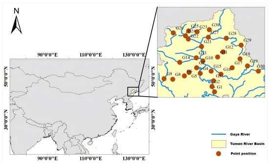This study was conducted along the Gaya River, China. The Gaya River extends approximately 206 km, serving as a major tributary of the Tumen River. In June 2023, thirty sampling sites were established at 10 km intervals to achieve adequate spatial coverage. All sampling took place under stable weather conditions to minimize environmental fluctuations (Figure 1).