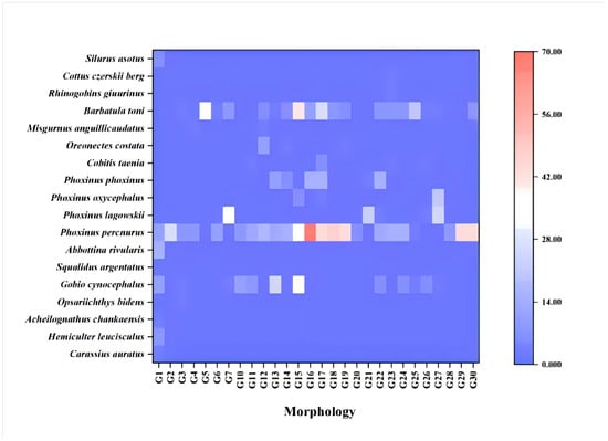Morphological sampling was conducted simultaneously using electrofishing and gill netting. Electrofishing was performed in shallow water areas (<1 m) within a 500 m river stretch, with a total sampling duration of 30 min. For deeper water sites (>1 m), gill nets were deployed for 60 min, with intermittent retrieval to reduce fish mortality []. Captured fish were identified, measured, and released on-site whenever possible, while unidentified specimens were preserved in 10% formalin and transported to the laboratory for taxonomic identification. Each sample species was identified by referring to the relevant reference books and Fish Base Search (www.fishbase.se/home.htm, accessed on 19 April 2025).