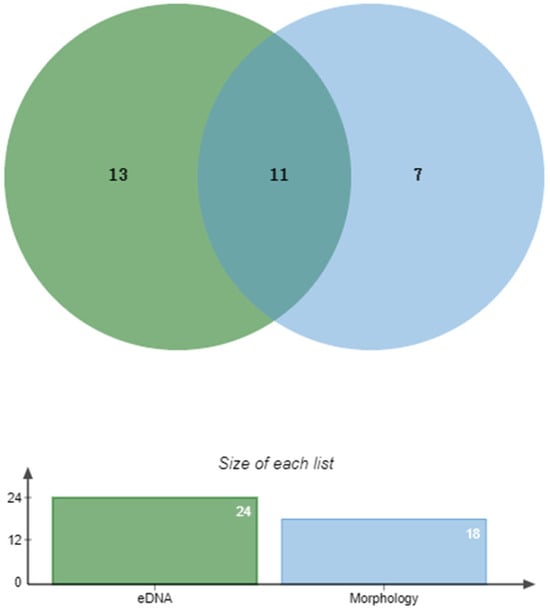 A total of 42 fish species were identified using both eDNA metabarcoding and morphological surveys. The eDNA method detected 24 species across 5 orders and 6 families, whereas the morphological approach identified 18 species from 4 orders and 5 families [] (Figure 2). Notably, 13 species were exclusively detected by eDNA, whereas 7 species were only identified through morphological surveys. Both methods identified 11 overlapping species, including Carassius auratus, Rhynchocypris percnurus, and Misgurnus anguillicaudatus (Figure 3).