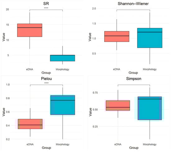 Comparison of species richness (SR), Shannon–Wiener index, Pielou’s evenness, and Simpson index values between eDNA and morphological surveys. **** denotes a highly significant difference between groups (p < 0.0001).