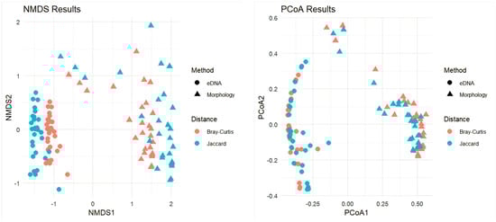 β-diversity analyses performed using NMDS and PCoA (Figure 5) showed distinct community structures detected by the two methods. NMDS ordination demonstrated separation along NMDS1, while PCoA analysis showed clustering differences between eDNA and morphological surveys. Partial overlap along NMDS2 in Jaccard-based ordination indicated some shared species composition.