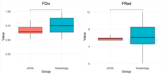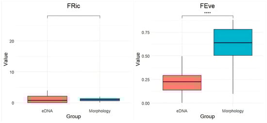 Functional diversity indices revealed significant methodological differences (Figure 6). Morphological surveys indicated a significant increase in functional evenness (FEve; p < 0.0001), while functional divergence (FDiv), functional richness (FRic), and functional redundancy (FRed) also increased, though not significantly.