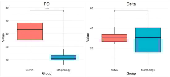 Comparison of PD, Delta, Delta*, Lambda+, and Delta+ indices between eDNA and morphological surveys. *** denotes a highly significant difference between groups (p < 0.001). **** denotes a highly significant difference between groups (p < 0.0001).