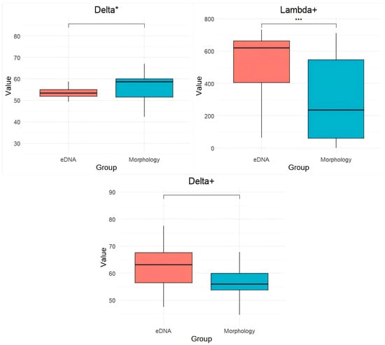 Phylogenetic diversity indices further supported differences between the two methods. The PD and species richness (SR) indices were significantly higher in eDNA-based assessments compared to morphological surveys. SR is highly significantly positively correlated with PD (p < 0.01) (Table 1). The Delta, Delta+, and Lambda+ indices were also elevated in eDNA assessments; Delta* showed an increase in morphological identification (Figure 7). Statistical analyses indicated that the differences in Lambda+ indices between the two methods were highly significant (p < 0.001).