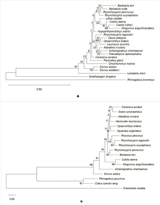 Phylogenetic trees were largely consistent with taxonomic expectations, with most species clustering according to their classification. For example, in the eDNA tree (Figure 8a), Barbatula toni and Barbatula nuda were grouped together, and Rhynchocypris species (e.g., Rhynchocypris percnurus and Rhynchocypris oxycephalus) consistently formed well-supported clades in both trees, corroborating established intrageneric relationships. However, discrepancies occurred—for instance, Misgurnus anguillicaudatus clustered with Cobitis taenia in the eDNA tree despite their belonging to different genera, possibly due to convergent benthic adaptations, incomplete lineage sorting, or environmental DNA cross-contamination []. Coverage also differed between methods: the eDNA tree contained species absent from the morphological tree (e.g., Hypophthalmichthys nobilis and Zacco platypus), whereas the morphological tree included species not detected by eDNA (e.g., Gobio cynocephalus and Hemiculter leucisculus).