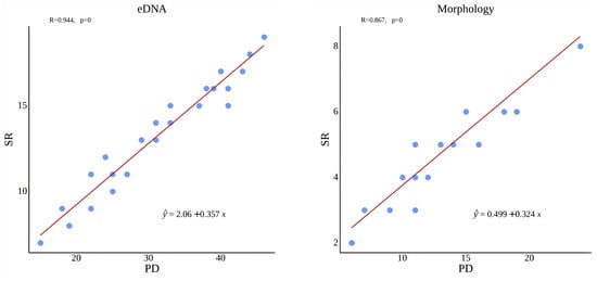 Correlation analysis of PD and species richness (SR) showed a significant positive relationship (Figure 9), indicating that increased taxonomic richness corresponds to higher phylogenetic diversity.
