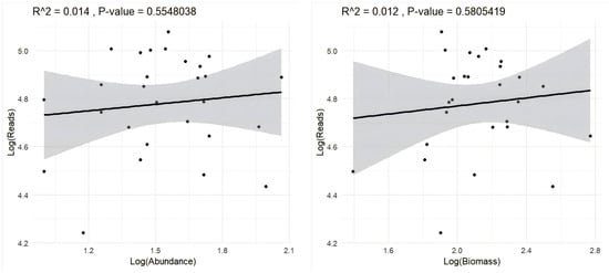 Relationship between log-transformed sequencing reads, species abundance, and biomass in eDNA and morphology-based surveys. Black dots indicate measurements from 30 sampling sites, and the shaded gray areas represent the 95% confidence intervals.
