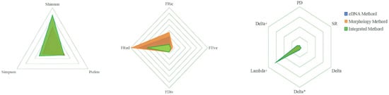 The radar charts exhibit the different diversity indices obtained via eDNA, morphological, and integrated methods.