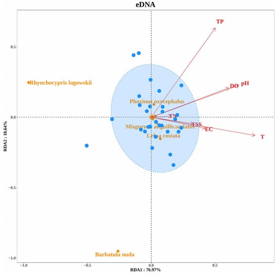 Redundancy Analysis (RDA) identified key environmental factors shaping fish community composition (Figure 12). Total phosphorus (TP), pH, water temperature (T), and total suspended solids (TSS) significantly influenced eDNA-derived communities, whereas total nitrogen (TN) and electrical conductivity (EC) were more strongly associated with morphological survey results. Species such as Rhynchocypris lagowskii and Barbatula nuda showed weak environmental associations in eDNA-derived communities, whereas Misgurnus anguillicaudatus and Lefua costata exhibited strong responses to multiple environmental factors in morphological survey results.