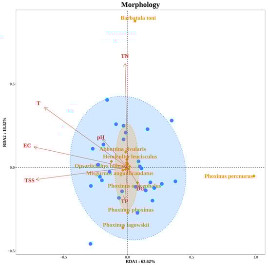 Redundancy Analysis (RDA) of environmental factors influencing fish community structure. Blue circles represent the 30 sampling sites, while orange diamonds denote specific species.