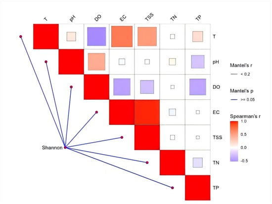 Interestingly, there was no significant correlation between environmental factors and Shannon diversity (p ≥ 0.05), challenging the general assumption that community species diversity is directly affected by the environmental gradient [,]. This indicates that the community aggregation of the Gaya River may be driven by more complex mechanisms, such as species interaction or habitat heterogeneity, rather than a single environmental gradient [].