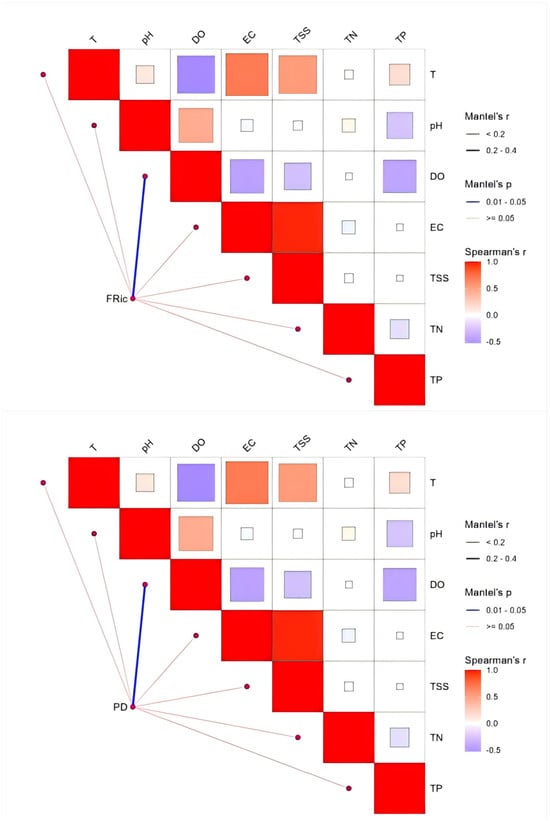 Regarding the diversity of the Integrated Fish Community Structure, Mantel test results (Figure 13) indicated that Shannon diversity did not show any statistically significant correlation with individual environmental factors (p ≥ 0.05). Regarding functional richness (FRic), dissolved oxygen (DO) had a highly significant positive effect (p < 0.01). Other factors, including temperature (T), total nitrogen (TN), and total suspended solids (TSS), also exhibited positive correlations with FRic, but these relationships were not statistically significant. Phylogenetic diversity (PD) was significantly influenced by dissolved oxygen (DO) (p < 0.05).