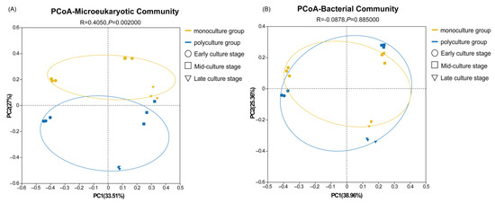 The PCoA results (Figure 1) demonstrated that the microeukaryotic community structures differed significantly between the monoculture and polyculture groups (R = 0.405, p = 0.002). In contrast, no significant difference was observed in the bacterial communities between the two groups (R = −0.088, p = 0.885). Additional PCoA analyses based on culture stage (early, middle, and late) revealed significant temporal differentiation (p < 0.05) in both microeukaryotic and bacterial communities (Figure S1), with early-stage samples clearly separated in microeukaryotes and all three stages distinct in bacteria, indicating that temporal dynamics are key drivers of community variation.