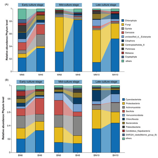 (A) Microeukaryotic community at the phylum level. (B) Bacterial community at the phylum level. Notes: M and B represent microeukaryotic and bacterial communities, respectively; N and H represent monoculture and polyculture groups, respectively; 6, 8, and 10 represent the early, mid, and late culture stage, respectively.
