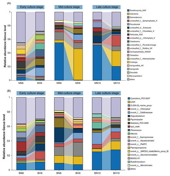 (A) Microeukaryotic community at the genus level. (B) Bacterial community at the genus level. Notes: M and B represent microeukaryotic and bacterial communities, respectively; N and H represent monoculture and polyculture groups, respectively; 6, 8, and 10 represent the early, mid, and late culture stage, respectively.