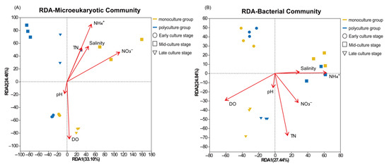 Redundancy analysis (RDA) showed that 57.7% of the variation in microeukaryotic communities could be explained by environmental factors (Figure 4A). Among them, DO (p = 0.023), NH4+-N (p = 0.006), and NO3−-N (p = 0.001) were significantly correlated with the microeukaryotic communities (p < 0.05). In the early culture stage, microeukaryotic communities in both the monoculture and polyculture groups showed positive correlations with pH and DO. In the middle stage, the monoculture group exhibited a strong positive correlation with nitrate nitrogen and salinity, whereas the polyculture group showed weak associations with environmental factors. In the late stage, the polyculture group showed a negative correlation with DO, whereas the monoculture group exhibited the opposite trend. For bacterial communities, 52.28% of the variation could be explained by environmental factors (Figure 4B). Except for salinity (p = 0.261) and pH (p = 0.762), all other environmental factors were significantly associated with bacterial communities (p < 0.05). Notably, the bacterial communities in both the monoculture and polyculture groups responded similarly to environmental factors across the culture stages: showing negative correlations with nitrogen and phosphorus nutrients in the early stage; a strong positive correlation with ammonium nitrogen in the middle stage; and strong positive correlations with TN and DO in the late stage.